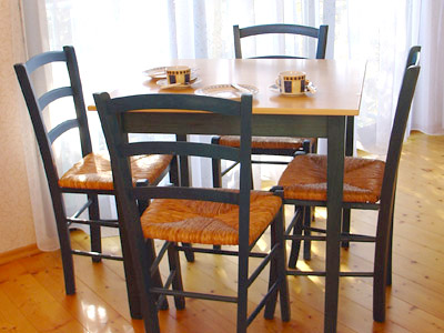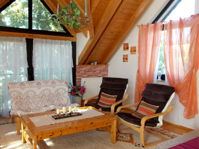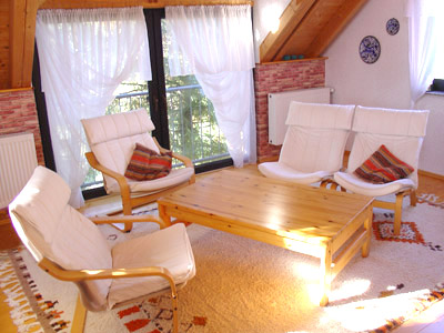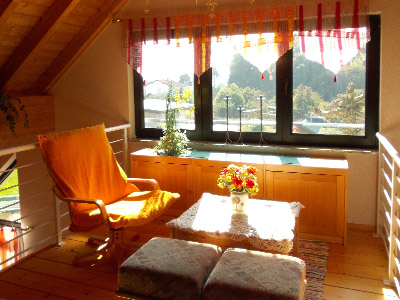 Es ist ausgestattet mit einer modernen Küchenzeile inklusive Essecke mit Balkon zur Südseite, einem gemütlichen Wohnzimmer-Bereich mit TV und Radio, Pariser Balkon mit Blick in den weitläufigen Garten, sowie dem Bad mit WC / Dusche.