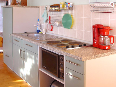 Die moderne Küchezeile ist komplett mit Kühlschrank, Herd, Mikrowelle, etc. ausgestattet.