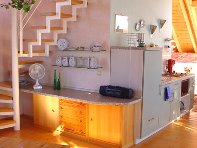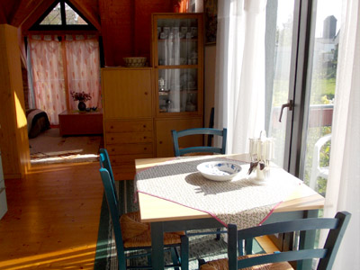 Die Maisonette-Ferienwohnung ist über eine steile Außen-Wendeltreppe zu erreichen. Auf ca. 70 qm bietet das offen gehaltene Dachstudio (keine abgetrennten Einzelzimmer) durch seine gemütliche, skandinavische Einrichtung behaglichen Komfort.
